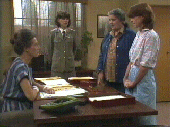 To prove that Bobbie isn't forgotten, Judy reads Pixie's letter to the women, asking after her and saying she's visited Cass. Joan tries to reprimand Heather and Dennis for turning up late to work. Meg reports back to Myra that she's had a call from Kay. Dot scalds Mrs O'Reagan and herself with hot fat.