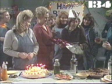 ![]() Meg ~ Elspeth Ballantyne Judy ~ Betty Bobbitt Lizzie ~ Sheila Florance Erica ~ Patsy King Bea ~ Val Lehman Jim ~ Gerard Maguire Doreen ~ Colette Mann Vera ~ Fiona Spence Kay ~ Sandy Gore Andrew ~ John Lee Vince ~ John Larking Captain Barton ~ Paul Young Ellen Huntley ~ Judith Dick Phyllis ~ Reylene Pearce June ~ Yvonne Foley Hazel ~ Maureen Edwards UNCREDITEDSally ~ Nanette WallaceTed Douglas (on the phone) ~ Ian Smith | Erica phones Andrew to let him know she won't let him take advantage of her or the women, though she does not cancel the project entirely. Doreen wonders why Lizzie has sweets instead of fags in her buyup. Captain Barton asks Bea what she thinks of the idea of a birthday party for Lizzie: Bea suggests that they keep it quiet and make it a surprise party. Jim clashes with Erica when he assumes the factory project has been cancelled. Hazel Crowe takes Andrew out onto the fire escape to discuss the issue of the prison workers: she lays down a list of conditions and threatens a strike knowing he can't afford to risk it. Meg takes Lizzie out of the laundry at Bea's request so she doesn't find out about the arrangements for the party. Jim finds Lizzie moping in her cell alone: their conversation prompts Lizzie to a flashback to Edie's death, but she looks up to find she's addressing her sob story to empty air as Jim has walked away. Ellen arrives to visit Lizzie and finds her in a very black mood. Ted phones Erica to tell her Paul has resigned, and she asks if a replacement can be found. Bea and Doreen give Lizzie the cold shoulder in the rec room to get rid of her so they can put up the decorations. Andrew visits Erica at home to plead his case. He admits to using her and the women, and Erica immediately forgives him. Lizzie's birthday breakfast is a miserable affair, and Meg asks her to take a tray to isolation to get her out of the way. Judy isn't in any better spirits, but when she hears it's Lizzie's birthday, she gives her Sharon's cigarette lighter as a present. Vera disapproves when Jim and Meg both seem to be giving presents to Lizzie and wants to know what is in the bottles Ellen has brought in for the party. Meg fetches Lizzie from her cell where she is celebrating on her own with a party hat made out of newspaper