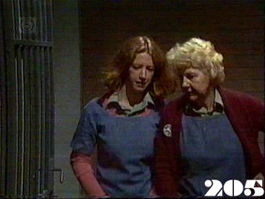 ![]() Meg ~ Elspeth Ballantyne Judy ~ Betty Bobbitt Lizzie ~ Sheila Florance Erica ~ Patsy King Bea ~ Val Lehman Jim ~ Gerard Maguire Doreen ~ Colette Mann Vera ~ Fiona Spence Margo ~ Jane Clifton Terry ~ Brian Hannan Bob ~ Anthony Hawkins Nick ~ Ned Manning Phyllis ~ Reylene Pearce Mr Muirhead ~ Denzil Howson Mrs Russell ~ Maggie Maxwell Race Caller ~ Clem Dimsey Erica does not appear in this episode. | Lizzie's book is officially "opened". Mr. Muirhead visits Meg at home and tells her that Nick absolutely must move out. Lizzie does very well with her first race. Terry moves in. Vera finds the betting ticket in his jacket pocket. Bob refuses to throw Nick out saying that it is his house and he can have anyone he wants in it. Bev and Lil are assigned as Lizzie's bodyguards. Margo collects her race winnings from Terry then turns around and shows Vera the money. Vera says that Terry wouldn't do such a thing. Margo laughs and says Vera must have it bad. Margo tries to place a bet with Lizzie, but is physically thrown out of the laundry by Bev and Lil. Margo asks Terry to place another bet for her, he agrees. Nick is blamed for some missing petty cash. Bob defends him. Margo informs the women that she has her own ways of placing bets. Vera confronts Terry about placing bets for Margo. He gets angry with Vera, but when she starts to cry he apologizes and says he won't do anything more for Margo unless she provides useful information. He later tells Margo the same thing. Lizzie has problems picking a horse so she asks Bea to read tea leaves. A relunctant Bea does so and says she sees "a hammer". Lizzie takes this as a divine revelation since there is a horse called Hammerhead in the race. Margo tries to get Phyllis to place a bet for her. Phyllis refuses. Margo then sneaks into Judy's cell and takes her tape recorder. Phyllis sees this and reports to Bea. Hammerhead is picked to come in dead last, but Lizzie poo-poohs this and offers double odds on the favorite. Bea, Doreen and Judy tear up Margo's cell and assault her when she comes - but there is no sign of the recorder. Hammerhead comes in dead last. Margo sneaks into the empty rec room and removes Judy's recorder from behind some books on the shelf. Lizzie confesses to Bea that she took too many bets and now does not have enough money to pay the women. Margo asks Terry to come into her cell. She says that she's prepared to pass on information but she wants a bottle of scotch in return. Terry agrees to bring it in. When he leaves Margo listens to the recording she just made of the conversation. This episode summary was written by Matthew Bubb.