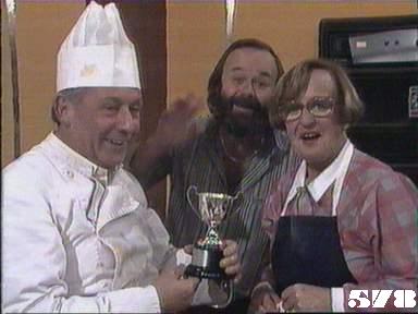 ![]() Meg ~ Elspeth Ballantyne Joan ~ Maggie Kirkpatrick Ann ~ Gerda Nicolson Joyce ~ Joy Westmore Nora ~ Sonja Tallis May ~ Billie Hammerberg Willie ~ Kirsty Child Daphne ~ Debra Lawrance Eve ~ Lynda Stoner Reb ~ Janet Andrewartha Julie ~ Jackie Woodburne Jenny ~ Jenny Lovell Lexie ~ Pepe Trevor Lou ~ Louise Siversen Mervin ~ Ernie Bourne Pippa ~ Christine Harris Ben Fulbright ~ Kevin Summers Bob Michaels ~ Paul Makin Floor Manager ~ Geoff Graham Francois Capri ~ Steven Smith Jonathon Edgely ~ Richard Aspel Mr Somerville ~ Gary Daniels Young Man ~ David Peatfield Special Appearance by: Pippa and Ben Fulbright do not appear in this episode Lexie says the teeshirts are to be photographed (rather than sold), so why didn't she just give them the designs rather than finished garments? | Lexie appeals to Joan to let her do some work to fix up the teeshirts and Nora has to threaten to use her phone call to contact the Governor before Joan will relent and let them use the laundry. Joyce regards the cookery contest as already won and looks forward to her new microwave - until she tastes Mervin's practice run. The women help Lexie clean up and repair her T shirts. Reb meets the women and mistakes Willie at the piano for Judy: Lexie can hardly believe that the withdrawn young women is the Reb she's heard so much about. Reb leaves the rec room in confusion and meets Joan for the first time since her return to Wentworth. Joan tells Reb her father is dead, but Reb has no idea what she's talking about. Nora makes Lou admit she damaged Lexie's teeshirts, and demands she comes to help fix them, but Lou just laughs in her face. Lexie doesn't feel she got a satisfactory result in the limited time she has, and Julie has to remind her how ungrateful she is being. Reb finds out from Nora some of the things she did when she was last in Wentworth, and is warned to stay away from Joan. Willie takes over the kitchen for the day: Reb is brought to do kitchen duty and asks where Ray is. Nora tells Lou why she won't bash her: she claims she is afraid of going too far. Mervin has a fit from the stress, thus delaying his appearance at the cookery contest. His opponents are a French chef who's won the competition twice before and a Englishman who's worked at the famed "Bon Appetit" in Paris. The host of the TV programme makes stale jokes about "porridge" and the like. Nora invites Reb to try the press, which reminds her of the time her head was under it by Myra. She runs out of the laundry and finds the staircase where Joan pushed her over and looks back to see (or imagine) Joan following her up