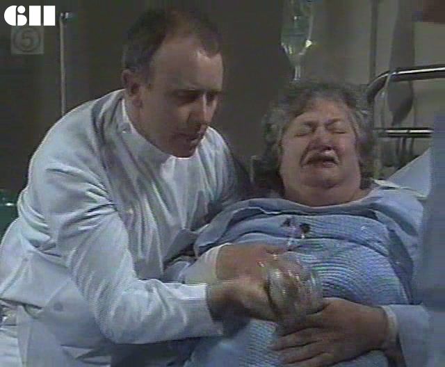 ![]() Meg ~ Elspeth Ballantyne Joan ~ Maggie Kirkpatrick Ann ~ Gerda Nicolson Joyce ~ Joy Westmore Jessie ~ Pat Evison Nancy ~ Julia Blake Rita ~ Glenda Linscott Julie ~ Jackie Woodburne Lou ~ Louise Siversen Lexie ~ Pepe Trevor Bob ~ Peter Adams Alice ~ Lois Collinder Flora Jenkins ~ Moira Claux Sean Jenkins ~ Steve Millichamp Pat Slattery ~ Dorothy Cutts Sister Hall ~ Gael Andrews Vicki McPherson ~ Rebecca Dines Mervin ~ Ernie Bourne Dan ~ Sean Scully Grub ~ Ingle Knight Doctor Standish ~ Merfyn Owen Nurse ~ Nicki Woolmington Ambulance Man 1 ~ Ray Hutchinson Young Woman ~ Sally-Anne Read Young Man ~ John Succo Fight Co-Ordinator ~ Glenn Ruehland Announcer ~ Kirk Alexander Newscaster ~ Cliff Wood Pocco the Dog ~ Pocco | Sister Hall is called to help a shrieking Jessie, but Lexie callously ignores Jessie's suffering. Julie worries that something in the can might have reacted with the brew. Lexie refuses to take any notice of Julie's strong disapproval of her attitude to Jessie. Rita tells Meg it must have been Lou who spiked the grog, but refuses to confirm Meg's theory about how the knife went missing from the kitchen. Alice pretends to have stubbed her toe to distract the officers and prevent them finding Pocco. Jessie is taken to hospital by ambulance, still in agony (with a blinding hangover, to judge from the way she is clutching her head). Rita orders Lexie to go in the ambulance with Jessie or she'll make sure all the women send her to Coventry. Lou overhears the Jenkins planning to dump her because she is ill with blood poisoning, so she gets the rifle from under her bed and loads it. In the ambulance Jessie croaks and overacts so much that Lexie is forced to promise to keep the baby. The women see news of Kath's arrest on TV. Most of them are disgusted but Nancy and Alice argue that they can't judge until they know all the facts. Sean tells his mother that it was Lou who was responsible for Alice serving extra time, so she marches off to confront Lou, who lets off one of the barrels into a wardrobe (incidentally revealing that it is made of much cheaper wood than appears at first sight). When she has got them back into the kitchen, Lou holds the Jenkins at gunpoint and forces Flora to tie Sean up. While they are waiting at the hospital, Joyce tells Joan that she will always regret it if she goes ahead and has an abortion. While Julie has her back turned, Pocco wanders off and disgraces himself: Pat finds a very small yellow puddle on the corridor floor. Julie enlists the other women to help look for Pocco, who we see has made her way to the staff room just after the officers have left. Bob reacts when Alice makes negative comments about Kath when another news report comes on the TV while he is in the rec room. Dan is amazed to get an invitation for dinner with Ann from Pippa. At home alone, Joan is so desperate she resorts to watching an episode of "Are You Being Served?" but she is obviously moved by a reference in the dialogue to "Captain Wagstaff" (perhaps it reminds her of her father?) and she leaves the house to walk the streets. Nancy gathers the women in the corridor before lockup to say a prayer for Jessie and inadvertently gives Pocco time to find his way back to Julie's cell. Joyce and Lexie are still at the hospital: Joyce successfully appeals to Lexie's better nature and she agrees to see Jessie when she comes round. Joan wanders the streets and is nearly tempted by a bar advertising old time dancing
