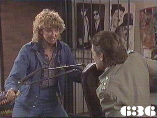 Janet tells Merle that Rita has torn her comics. Marty catches Kath clearing up the comics and they both convince Merle that Rita wasn't to blame, though Marty is really pushing it to expect her to believe her comics were ripped up by Vandals from Outer Space. Jenny lets Joan know she blames her for her father's death . Kath is forced to keep her part of the bargain and tell Marty it was Janet who ripped the comics. Lexie sees Roach taking the herbs from the drier and suggests another angle. Jenny asks Joan to move out of Andrew's house. Roach gets the money from Rodney and tells him the rest of the drugs are behind the drier, while Lexie tapes the transaction on video from behind a wardrobe. Marty catches Roach paying Janet and confiscates the money. Rodney hands the "dope" to Ann who goes to the laundry and confirms that they are only herbs. Ann warns Rodney of the dangers of using informants. Marty brings in a pile of comics for Merle bought with Rodney's money that he confiscated from Janet. Rodney goes to heavy Roach, but Lexie stops him in his tracks by telling him about the video. Delia promises to look into Rita's suggestion that they could be given the opportunity to do work experience, Lexie accurately remembering that the last person to do it was Bobbie Mitchell. Joan is told that Parker has been murdered while being held in police custody and switches on the TV just in time to catch a news bulletin. Rita and the women are also watching the same TV programme and Rita is even more determined to kill Joan now she has lost her protection: Nancy tries to dissuade her. Mervin returns from holiday (still in Tyrolean costume and such a state of confusion that he thinks "Buon giorno" is French) and gives Merle a snow globe. Delia offers to organise a work release program. Joan returns to work and is questioned by Ann about Kath's remarks in her sleep. Joyce entertains the women with tales of her honeymoon trip. Rita goes to the kitchen to get Mervin to come out and show his costume , and uses it as an opportunity to get a knife from the kitchen. Joan takes the globe from Merle charging her with stealing it and goes later to Kath's cell to smash it as a warning of what she can do to Merle if Kath won't co-operate with her schemes. Delia asks the women what kind of work they would be interested in, and gets the usual predictably unrealistic suggestions. Lexie demands that Rodney smuggles goods inside in return for the tape. Joan tells Janet she isn't interested in dealing with her on her own. Rodney views the tape then destroys it, but Lexie tells him they've made a copy. Rita waits in the rec room for Joan: the plan is for her to be sent there by Alice by saying she's seen Merle ripping up books. Nancy tackles Alice over what's going on and the women break up a knife fight between Rita and Joan : Nancy asks Rita to hand over the knife.