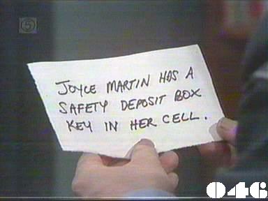 EPISODE 47Broadcast on Channel 5 (UK) 21 May 1997 Wed 4:40 a.m. Blossom asks Jim for help![]() Jean ~ Christine Amor Monica ~ Lesley Baker Meg ~ Elspeth Ballantyne Jim ~ Gerard Maguire Lizzie ~ Sheila Florance Erica ~ Patsy King Bea ~ Val Lehman Doreen ~ Colette Mann Greg ~ Barry Quin Vera ~ Fiona Spence Karen ~ Peita Toppano Edith ~ Colleen Clifford Peter ~ Carrillo Gantner Det Sgt Grace ~ Terry Gill Martha ~ Kate Jason Denise ~ Linda Keane Joyce ~ Judy Nunn Melinda ~ Lulu Pinkus Tom ~ Hu Pryce Officer Grahame ~ Susan Arnold Officer ~ Jean Cain Leila ~ Penny Ramsay Carol ~ Judith Roberts Paula ~ Trudy Simms Suzanne ~ Joanna Weir Doreen is supposed to be in hospital and does not appear in this episode. Her next appearance is in (55) though the credits continue to list her in the interim. | Monica is released from solitary and asks to see the Governor. Jim wants everyone leaving the prison to be searched with a metal detector, in case the key is smuggled out. Monica asks if she could be told the result of Fred's trial and Erica agrees though she thinks it odd in view of what Monica is inside for. Jean tells Karen she'll be eligible for parole in four weeks and wants her opinion of Dr Clements, as she's concerned about the effect he is having on some of the women. Monnie learns that Fred has been given 2 years. Erica announces the new security measures to all the women, but does not say what the "item" they are looking for is. Lizzie accuses Dr Clements of driving Doreen mad: Greg asks him to leave the infirmary then goes to Erica to complain. Bea warns Monica she can't count on any support from her if she insists on going ahead with her plan to bash Blossom. Dr Clements takes his reprimand from Erica cooly and invites her for dinner to find out more about the prisoners: she reluctantly accepts. Joyce accuses Jim of having the key: he smugly thanks her for confirming that the key does really exist. Blossom wants help from Jim, and in return offers to share the money. Despite appearing to refuse her offer of a deal, Jim does protects Blossom from another attack from Monnie. Jim visits Leila to discuss whether they could get back together if he suddenly got a lot of money. Blossom calls in Sgt Grace to tell him the full story before she goes to court so he will speak up for her. Jim now tells Blossom he will help her to get the key out in return for half the money. One of the officers objects to the search with the metal detector |