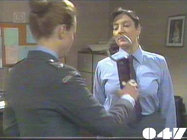 EPISODE 48Broadcast on Channel 5 (UK) 22 May 1997 Thurs 4:40 a.m. Jim makes a deal.![]() Jean ~ Christine Amor Monica ~ Lesley Baker Meg ~ Elspeth Ballantyne Jim ~ Gerard Maguire Lizzie ~ Sheila Florance Erica ~ Patsy King Bea ~ Val Lehman Doreen ~ Colette Mann Greg ~ Barry Quin Vera ~ Fiona Spence Karen ~ Peita Toppano Edith ~ Colleen Clifford Peter ~ Carrillo Gantner Det Sgt Grace ~ Terry Gill Martha ~ Kate Jason Denise ~ Lynda Keane Joyce ~ Judy Nunn Melinda ~ Lulu Pinkus Tom ~ Hu Pryce Bob ~ Paul Glen Policeman ~ Brian Hickey Officer ~ Judith McGrath Leila ~ Penny Ramsay Carol ~ Judith Roberts Thanks to Bjorn Wallgren for providing the credits above from the Swedish second run on 2nd February 2001, as most other showings seem to have an incorrect version: see below for further comments. Doreen is credited but does not appear in this episode. Erica tells Peter that "all staff files are held at the Department". Why? Must make administration a bit difficult, surely? If Meg is so mumsy, how could she resist reaching over and tucking in Greg's collar in this scene | Colleen Powell unlocks the cells in the morning instead of Jim, but she's a new officer and doesn't know much about the reasons why Jim isn't there. Jim goes to meet Blossom and he agrees to go to a motel room with her, a room which she has booked. Tom meets Peter outside Wentworth (purely so he can offer an opinion on Vera as she passes - "a raving lez"): he tells Peter he has decided to end the affair with his student. Vera gloats to the new officer that Jim was suspending for having it off with one of the prisoners. After having sex with Blossom |