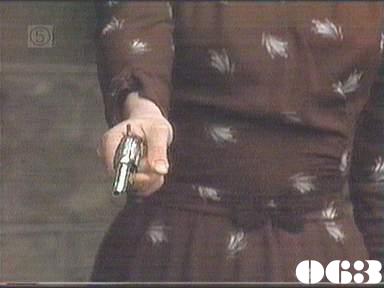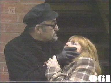 Broadcast on Channel 5 (UK) 07 June 1997 Sat 4:40 a.m. Glenys is threatened. CREDITSMeg ~ Elspeth BallantyneLizzie ~ Sheila Florance Erica ~ Patsy King Bea ~ Val Lehman Doreen ~ Colette Mann Greg ~ Barry Quin Vera ~ Fiona Spence Karen ~ Peita Toppano Antonia McNally ~ Pat Bishop Angela Jeffries ~ Jeanie Drynan Glenys Buchanan ~ Roz French Judith-Anne ~ Kim Deacon Martha ~ Kate Jason Terry Mansini ~ Burt Cooper Mum ~ Mary Ward Hit Man - Rory ~ Gene Van Dam Hit Man - Brian ~ Marcel Cugola Detective (1) ~ Kevin Summers Detective (2) ~ Bob Ruggiero Officer Morgan ~ Betty Hargrave Meg should have keep this scarf | ... but she knees one of the hit men in the balls and runs away. Bea wonders aloud to Toni why she killed Jacqui Coulson herself when she could have just got someone to do it for her. This moment of female bonding is interrupted by Vera who sarcastically enquires "Pyjama parties now, Smith?" After apparently wandering through the woods all night and somehow undoing the tape over her mouth while her hands are still tied |