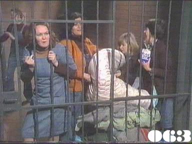 Broadcast on Channel 5 (UK) 04 June 1997 Wed 4:40 a.m. Erica resigns. CREDITSMonica ~ Lesley BakerMeg ~ Elspeth Ballantyne Lizzie ~ Sheila Florance Erica ~ Patsy King Doreen ~ Colette Mann Greg ~ Barry Quin Vera ~ Fiona Spence Karen ~ Peita Toppano Antonia ~ Pat Bishop Angela ~ Jeanie Drynan Martha ~ Kate Jason Kathleen ~ Penny Stewart Suzanne ~ Joanna Weir Frank Thompson ~ Tom Lake Officer Barfield ~ Kate Fell Maura ~ Lena Fishman Old Codger ~ Bill Bennett Old Biddy ~ Hannah Govers Officer ~ Jean Cain | Toni antagonizes Vera with her superior attitude and Meg with her claim to have "fixed" Jim's leave. Vera goes straight to Erica to complain about Toni, but only succeeds in making her angry. Karen gets a job as a waitress in a grotty cafe, despite being up against another woman who has "everything else going for her" as the cafe owner says. Toni involves all the women in the laundry in her next attempt to smuggle in contraband. Lizzie distracts the officers by pretending an interest in a delivery of powdered milk. Erica and Vera watch while Toni is forced to open the tins of powdered milk for contraband while the real stuff comes in via the rubbish bins. Karen's student friend Suzanne tries to get her to attend a meeting of the Prisoners' Reform Group. Toni offers the owmen some pot to celebrate the success of the operation. Monica is annoyed but is caught trying to get to solitary to tell Bea about Toni's drug smuggling. Meanwhile the women are getting stoned out in the garden and continue later in the rec room after attacking their dinner with unaccustomed keenness due to an attack of the munchies. Vera realises what is going on and reports it to Erica, but the women deny any knowledge and Martha claims to have found the joints in the garden. Toni points out that she isn't stoned, which surely she would be if she were responsible. Later, Toni challenges Erica to her face to prove she has been involved in smuggling drugs. Karen's friend Suzanne brings Angela Jeffries to her hotel room to meet her, and Angela manages to persuade her to attend a meeting of the PRG. Vera ropes Meg in to tackling Erica, and she confesses to them that the Department have indeed put her under pressure to go easy on Toni, and that she has already written her letter of resignation in protest. Lizzie protests that the pot had no effect on her at all. Vera gets Monica to tell her where the contraband is hidden by arguing that it would help Bea, though Vera ends up searching through the garbage |