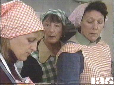 EPISODE 132Broadcast on Channel 5 (UK) 03 September 1997 Wed 11:30 p.m. Noeline disrupts the factory project and is transferred from Wentworth. Pauline informs the police about Judy. And Erica offers Bea a chance.![]() Meg ~ Elspeth Ballantyne Judy ~ Betty Bobbitt Lizzie ~ Sheila Florance Erica ~ Patsy King Bea ~ Val Lehman Jim ~ Gerard Maguire Doreen ~ Colette Mann Vera ~ Fiona Spence Margo ~ Jane Clifton Gail ~ Susanne Haworth Noeline ~ Jude Kuring Kay ~ Sandy Gore Andrew ~ John Lee Captain Barton ~ Paul Young Tony ~ John Higginson Weasel ~ Colin Vancao Pauline ~ Anne Pendlebury George Burke ~ Rick Ireland Soo Ling ~ Eric Poon Peter Curtis ~ Peter Byrne UNCREDITEDOfficer Phillip ~ Lise RodgersPoliceman ~ Bill Binks Vera refers to her silent colleague as "Miss Meadows" Gail says that she stood up for herself after "Mr Reid talked to me", but it was really Captain Barton who gave her the pep talk. | Kay promises to keep Vera occupied to give Noeline time to get the bolt of cloth out of the tea room window |