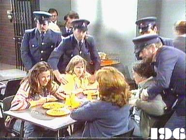 EPISODE 196Broadcast on Channel 5 Wednesday 28 January 1998 04:40 Lizzie is becoming more and more frightened about the atmosphere in the prison.![]() Meg ~ Elspeth Ballantyne Judy ~ Betty Bobbitt Lizzie ~ Sheila Florance Erica ~ Patsy King Bea ~ Val Lehman Jim ~ Gerard Maguire Doreen ~ Colette Mann Vera ~ Fiona Spence Chrissie ~ Amanda Muggleton Officer Powell ~ Judith McGrath Officer Barry ~ Joy Westmore Hazel ~ Belinda Davey Del Latham ~ William Zappa Mr Douglas ~ Ian Smith Restaurant Manager ~ Curt Jansen Man No. 1 ~ Doug Scroope Man No. 2 ~ Doug Bennett Nurse ~ Lucy Charles Barman ~ Shane Bourne | The corridors are silent when Jim and Colleen check up later, though the din resumes after their dialogue. The women are taken for their showers a few at a time next morning and are then locked back in their cells. Chrissie tells Meg that the only way she can get Elizabeth back now is to earn a little money on her own account: she goes for a job in a restaurant, but the owner sees through her claim to have references from New Zealand. Lizzie tells Bea she's too old to get involved in any protests. Meanwhile, Doreen is trying to calm down Judy by telling her that Bea has everything under control. After seeing an article in the paper, Chrissie's brother Derek calls on Meg to ask if he can help Chrissie, as he feels he let her down when they were kids: he offers to have Chrissie and Elizabeth live with him and his wife. Erica proposes to the officers that a round table discussion with the inmates might help, but Colleen demands that the officers are armed. The meeting goes ahead in the rec room: Bea gives a list of their demands but when they get nowhere and try to leave the officers shoulder their arms. Bea demands an outdoor exercise period when Erica tries to call a halt to the meeting. Chrissie calls at the home to see Elizabeth and finds Derek has traced her there |