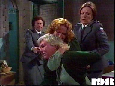 EPISODE 198Broadcast on Channel 5 Saturday 31 January 1998 4:40 Margo is sentenced to ten years and Judy is confined to solitary.![]() Meg ~ Elspeth Ballantyne Judy ~ Betty Bobbitt Lizzie ~ Sheila Florance Erica ~ Patsy King Bea ~ Val Lehman Jim ~ Gerard Maguire Doreen ~ Colette Mann Vera ~ Fiona Spence Margo ~ Jane Clifton Officer Powell ~ Judith McGrath Hazel ~ Belinda Davey Phyllis ~ Reylene Pearce Tracey Morris ~ Sue Devine Janie Chapman ~ Alix Longman Marie Winter ~ Maggie Millar Mrs Roberts ~ Gerda Nicolson UNCREDITEDPersonnel consultant ~ Charles Gilroy | At breakfast Judy, Hazel and Phyllis all "vie" for top dog, but it is only a ploy to make the staff feel that there will be too much unrest if Bea is not returned. Margo, who is going in for sentencing that day, doesn't want to be a part of it. She expects to get 4 to 5 years. Another "brawl" is staged in the laundry. Colleen reports it to Erica, but Erica merely says that fighting for Bea's place is to be expected. Margo gets 10 years and tells Judy she'll take part in anything. Jim broods to Meg about how badly he was treated as acting Governor. Meg tells him to do something about it. At a staff meeting, Erica says she wishes to form a Prisoner's Needs Committee. Vera, Jim, and Colleen exchange irritated glances. Back in the laundry the women continue to call each other fat and stupid until Margo snaps and genuinely bashes Judy. Judy is blamed and sent to solitary. Jim tells Vera he is looking for another job. Vera is delighted and wishes him luck. Margo announces to the other women that she is Top Dog. Down at Barnhurst, Bea is enjoying the quiet and tells Tracey she's content to stay there. Janie thinks it would be fun to drug Bea with mushrooms. Marie agrees and they force Tracey to do it. Erica discusses the Prisoner's Needs Committee with Margo. It is a short discussion. At lunch, Tracey drops mushrooms into Bea's soup. A doped-up Bea |