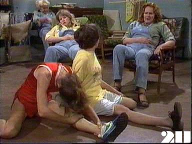 EPISODE 211Broadcast on Channel 5 Wednesday 18 February 1998 04:40 Meg brings the solicitor to see Michelle; Erica finds the love-letters that her father wrote to her mother; and Lori is taken to the Parole Officer.CREDITSMeg ~ Elspeth BallantyneJudy ~ Betty Bobbitt Lizzie ~ Sheila Florance Erica ~ Patsy King Bea ~ Val Lehman Jim ~ Gerard Maguire Doreen ~ Colette Mann Vera ~ Fiona Spence Terry ~ Brian Hannan Lori ~ Susannah Fowle Michelle ~ Nina Landas Henry ~ John Bowman Officer Powell ~ Judith McGrath James Marne ~ James Frawley Gwen Hill ~ Jackie Kelleher Amelia Humber ~ Myrtle Woods Tony Morton ~ Chris Milne Newsreader ~ Adam Joseph | The Keep-Fit class ends with Jim about as winded as the women. Meg visits with Erica, who thanks her for the dinner. Erica then tell Meg that she must go to the country to sort through her mother's things. "Going through Mother's dresses", seems to especially upset her. Both Michelle and Henry meet with Tony Morton. The police have now established Michelle's fingerprints at the crime scene and, without the "mysterious old lady", things look worse than ever. Michelle shoots Henry a look. As he leaves, Henry assures Michelle that he'll do what he can. In the laundry, Doreen blows kisses and makes cooing noises at Lori. Vera enters and, sensing a good opportunity, tells Lori to help Doreen at the washer. Erica and James drive down to the country. James wants to sell the family home, Erica does not. Doreen purposely has Lori pour dye into the washer. Gwen brings Erica and James their mother's personal letters. Erica trembles before them, but James insists that she start reading them. The sheets come out of the water a deep blue. Vera yells at Lori and drags her out of the laundry. Erica is frozen over a particular letter. James asks her what's wrong. It is a love letter from their father to their mother. "Spring is here..." and the music plays as Erica reads the thing. Erica is profoundly moved that their parents once loved one another. Lori tells Vera that she didn't know it was dye she had used. Vera is prepared to believe her but advises her to wise up. Lori then meets with Meg for her report. She gives Meg nasty attitude. Meg doesn't understand this and informs Lori that if she is forced to hand in a bad report she could get a very severe sentence. This doesn't seem to register and Lori continues with the attitude. Jim wanders into Michelle's cell. She is moping about her missing witness. Jim agrees to go to the park and look for the woman as well. Judy has words with Doreen in the laundry, then Terry enters and informs Doreen and Bea that they are to have a new cellmate. Bea says it's probably "Some tart on the jungle juice". Terry informs them that its just Lizzie moving back from maternity. Bea smiles, "See, I was right." Erica and James say good-bye to Gwen and to the house. Michelle talks to Bea in the rec room, telling her that she intends to "produce" a witness. Bea thinks its a good idea. Lizzie returns and gets a letter from Sid. He is doing well and living with his family - but not getting on with his son, Gordon. Michelle gets a note from Henry reporting no luck so far. Meg takes Lori to Erica's office, but Lori continues to be unhelpful. Erica sends for Judy. While training some other runners in the park, Henry encounters Amelia Humber, a sweet little old lady who loves watching the athletes. It turns out she has even heard of Michelle's record runs. She use to follow Michelle on the telly, but now its broken and on her pension...the wheels turn in Henry's head. Judy comes to Erica's office and, upon being told of Lori's behavior, sets Lori straight. Lori agrees to cooperate. Lizzie visits Judy and asks what the story is with Lori. Judy can't tell her but thanks her for being understanding and not listening to gossip. Lori has overheard. When Lizzie leaves she tells her mother that she just doesn't understand the cover-up. But Judy will not be swayed. The next day brings heavy rain and the Keep-Fit class is held inside. When the other women tell her she is too old, Lizzie is outraged and goes to change for the class. The women run through the corridors. Lizzie hides out in a cell until they return then comes running in after them, fresh as a daisy and doing leg stretches with Michelle |