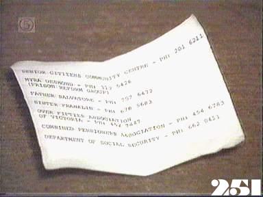 EPISODE 251Broadcast on Channel 5 Friday 17 April 1998 04:40 When security cameras are installed, Meg organises a strike. Lizzie befriends a con man.![]() Meg ~ Elspeth Ballantyne Judy ~ Betty Bobbitt Lizzie ~ Sheila Florance Erica ~ Patsy King Bea ~ Val Lehman Jim ~ Gerard Maguire Officer Powell ~ Judith McGrath Kate ~ Olivia Hamnett Steve ~ Wayne Jarratt Sandy ~ Louise Le Nay Marie ~ Maggie Millar Janet ~ Kate Sheil Ernie (Barman) ~ Syd Conabere Errol ~ Frankie J. Holden Mighty Mouse ~ Jentah Sobott Mr Douglas ~ Ian Smith Barman ~ Lazar Rodic Reporter (No. 1) ~ Bill Manderson Reporter (No. 2) ~ Jon Evans Reporter 2 is credited to Brian Rock, but I have changed this to the name of the actor who later plays Neville Sloan, as they seem to be the same | Bea accuses Marie of selling drugs to Mouse, who is giggling and gurning in the dining room |