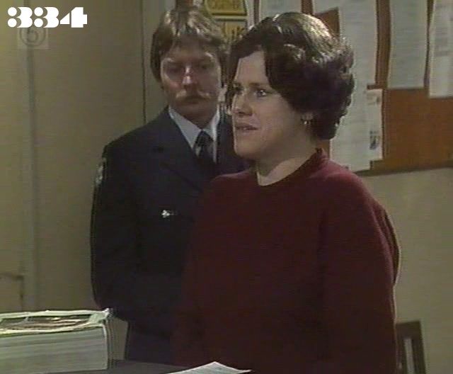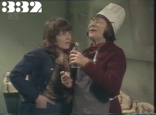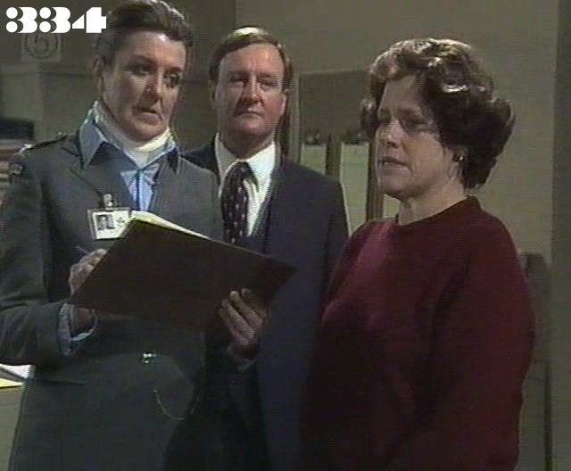 EPISODE 334Broadcast on Channel 5 Tuesday 11 August 1998 04:40 Joan discovers the illicit drink which she reports to Erica.CREDITSMeg ~ Elspeth BallantyneJudy ~ Betty Bobbitt Lizzie ~ Sheila Florance Erica ~ Patsy King Joan ~ Maggie Kirkpatrick Bea ~ Val Lehman Off. Powell ~ Judith McGrath Chrissie ~ Amanda Muggleton Margo ~ Jane Clifton Paddy ~ Anna Hruby Maxine ~ Lisa Crittenden Jean ~ Carole Skinner Jerry ~ Peter Harvey-Wright Det. Cons. Crosby ~ Jeffrey Hodgson Visiting Justice ~ Lloyd Cunnington Heather ~ Julie Hilton Desk Sergeant ~ Peter Black Radio Announcer ~ Rob Maynard | Joan offers to join in the women's celebrations, for as she points out, "we've been through a lot together". Bea comments that she wishes she'd killed Joan when she had the chance, but Bea reminds her she's speaking to the person who saved her life. Bea spits in Joan's face: Joan merely wipes it away and proposes a toast to eveyone's "future", but insists on taking Lizzie's drink to do it. Having tasted it ~ ~ ~ The ages read out on the radio for Barbara (23) and Mouse (19) are rather implausible... When Bea's solicitor "signs in", it is clearly into a standard desk appointment diary: it has the month NOVEMBER visible at the top The uncredited uniformed poilceman at the station looks remarkably unmoved in Nola's presence The flashbacks during Bea's hearing include this brief high angled shot |