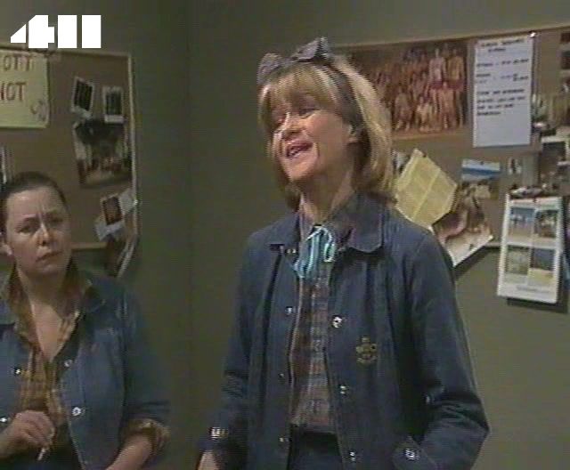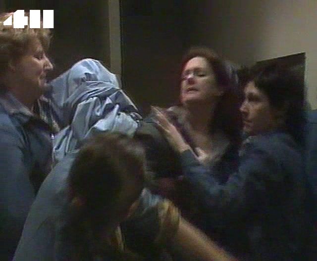 EPISODE 412Broadcast on Channel 5 Saturday 28 November 1998 04:40 Randi puts her plan for revenge into action and Judy receives her verdict. Repercussions of the hanging shake Wentworth.![]() Meg ~ Elspeth Ballantyne Judy ~ Betty Bobbitt Lizzie ~ Sheila Florance Joan ~ Maggie Kirkpatrick Colleen ~ Judith McGrath Ann ~ Gerda Nicolson Wally ~ Alan Hopgood Pixie ~ Judy McBurney Sonia ~ Tina Bursill Cass ~ Babs McMillan Minnie ~ Wendy Playfair Bobbie ~ Maxine Klibingaitis Scott ~ Tim Elston Brenda ~ Carmen Warrington David ~ David Waters Paul Reynolds ~ Paul Newman Samantha ~ Dina Mann Phyllis ~ Reylene Pearce Randi ~ Zoe Bertram Frances ~ Wanda Davidson Jack Brennan ~ Ian McKleish Lionel Fellowes ~ Will Deumer Ray Foster ~ Thomas Coltrane Don Baxter ~ Alan Lee Det. Insp. Thorne ~ Peter Aanensen Dr Fredericks ~ Curt Jansen Mr Walsh ~ Raymond Rich Nurse ~ Nicki Duncan Apart from the mistake over the actress playing Samantha, these credits are full of inconsistencies: "Francis"; Lionel "Fellows" played by Will "Duemer"; Det. Insp "Thorn" played by Peter "Aanenson". I suspect that Ian "McKleish" is also a misspelling. | Pixie feels sick and David helps her to the toilet, where they find Joan: he holds her up to take the weight off the rope and tells Pixie to use the knife in his top pocket (!) to cut her down. Brenda is furious to find that Joan may have been killed, and a major source of income cut off. Minnie organises an alibi for the women by hustling them off to the rec room. Samantha impresses Ann and Paul with her individual approach to the law. Ann is called to the prison and the women start to concoct their alibis for her. Colleen confirms that the sheets came from Mary's cell and that she is missing. Ann tells the women that Joan is still alive, which makes one or two of them look a little nervous. Lizzie suspects that David helped Mary to escape after she notices that David pretends not to even know who Mary was. Sam asks Wally leading questions to find out if he's committed to Ann. David finds a hole in the fence, but Colleen cannot remember seeing Mary during the exercise period. Jack tells Brenda that Don is double-crossing Fellowes and needs the money to get away. Lionel Fellowes is one step ahead, and tells Ray to dispose of Don. Joan discharges herself from hospital against medical advice, saying she has "things to do". Minnie runs rings round Det. Insp. Thorne and manages to avoid giving him any useful information. Randi pretends to apologise to Meg in order to slip something into her pocket: Pixie sees the incident, bumps into Meg and lifts it from her pocket. Randi asks to see Ann about a receipt for a diamond necklace which she claims to have given to Meg before dinner. Meg denies it and to settle the matter Ann allows Randi to search Meg's pockets. Meg demands to be given a locker search and body search for her own protection. Joan takes out a high interest cash loan from a finance house. David tells Pixie he's given her an alibi so she doesn't need to be interviewed by the police about the attack on Joan. Meg explains to Ann about Randi and Marty and tells her she thinks this is why Randi is trying to set her up. Ann is told that Judy has been sentenced to 5 years. David offers to help "free" Sonia when she tries to sound him out to see whether he would be willing to smuggle goods inside. Lizzie fakes a heart attack in Minnie's pickpocketing class and empties Cass and Pixie's pockets. The things in Pixie's pocket include Randi's necklace. Randi tries to claim the necklace back, but Minnie allows Pixie to keep it. Pixie is knocked out in her cell and the necklace taken: Meg finds her when she accompanies Judy back to her cell. Ann notices a lump in her breast. The women realise Tracy Dixon has gone missing. Joan goes to pay off the blackmailer, but finds him dead. |