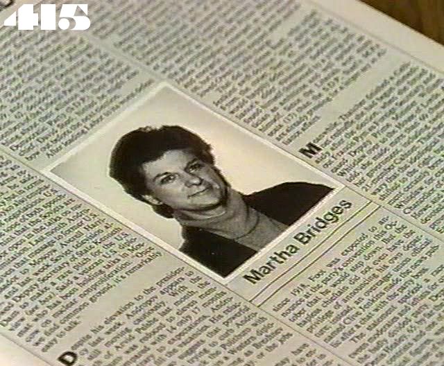 EPISODE 415Broadcast on Channel 5 Wednesday 02 December 1998 04:40 Paul Reynolds has a lucky break and Joan's plan is set in motion. A mystery surrounds David's mother.![]() Meg ~ Elspeth Ballantyne Judy ~ Betty Bobbitt Lizzie ~ Sheila Florance Joan ~ Maggie Kirkpatrick Colleen ~ Judith McGrath Ann ~ Gerda Nicolson Wally ~ Alan Hopgood Pixie ~ Judy McBurney Sonia ~ Tina Bursill Minnie ~ Wendy Playfair Cass ~ Babs McMillan Bobbie ~ Maxine Klibingaitis Scott ~ Tim Elston Phyllis ~ Reylene Pearce David ~ David Waters Paul Reynolds ~ Paul Newman Brenda ~ Carmen Warrington Belinda ~ Jane Turner Samantha ~ Dina Mann Arthur Charlton ~ Roy Edmunds Ray Foster ~ Thomas Coltrane Lionel Fellowes ~ Will Deumer Kylie Dence ~ Sally-Ann Creswick Det Insp Bates ~ Ian Walker Driver ~ Henry Gawel | Ann asks Joan to continue with the search and to make sure the radio broadcasts are discontinued. Colleen tells Ann to go home and she'll hold the fort: Wally meets her outside and insists they talk. David offers to "help" Judy but when she raises the subject of Randi "getting off OK", he pretends not to know what she means. Ann is prevented from telling Wally about her illness by his confession about his misbehaviour with Sam. This infuriates her so much she sends him away. The women are sent back to their cells early. Wally confides in Paul, who innocently invites Wally to dinner with him and Sam. Joan plays "find the toothpaste" The article supposedly on unsolved murders with the picture of Martha Bridges unconvincingly pasted in the middle |