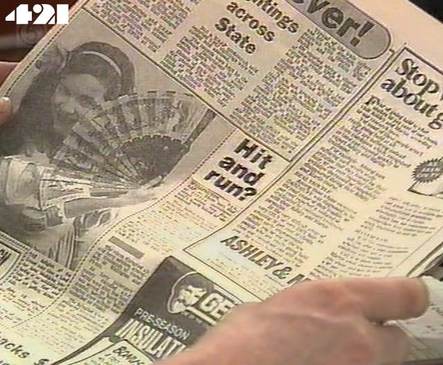 EPISODE 421Broadcast on Channel 5 Friday 11 December 1998 04:40 Belinda prepares a nasty surprise for Sonia. Colleen risks her career by standing up to Joan.CREDITSMeg ~ Elspeth BallantyneJudy ~ Betty Bobbitt Joan ~ Maggie Kirkpatrick Colleen ~ Judith McGrath Pixie ~ Judy McBurney Sonia ~ Tina Bursill Minnie ~ Wendy Playfair Cass ~ Babs McMillan Bobbie ~ Maxine Klibingaitis Phyllis ~ Reylene Pearce Helen ~ Caroline Gillmer Belinda ~ Jane Turner Rick Manning ~ Andy Anderson Charles Harnsworth ~ Tom Lake Off. Radcliffe ~ Marion Dimmick Sister Kelly ~ Liddy Holloway Terence Makin ~ John Shaw Bus Driver ~ Kevin Hobson Harry (cat) ~ Allistair In an curious touch of continuity, Bobbie is shown slicing pineapples in an early scene: later for lunch the women are served gammon and pineapple. | Meg finds Sonia on the floor of her cell moaning pitifully "Help me, Mrs Morris". Colleen tells Meg that Minnie's report shows that Minnie was poisoned with valium acetate. Cass tells Bobbie she doesn't want to be the "bash artist" any more. To try to cheer her up over Snoopie's death, Bobbie suggests Cass adopts the kitchen cat Harry as a pet. Sonia is interviewed about the attack on her: she blames Cass for the attack on her. Joan pretends to be reading the paper |