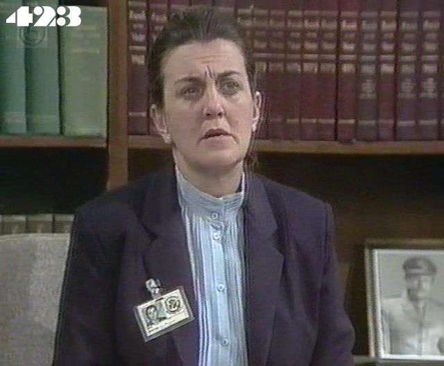 EPISODE 423Broadcast on Channel 5 Sunday 13 December 1998 04:40 Joan forces the women to take an all-night sauna. Judy is degraded, but cannot speak up for herself. Colleen's last hopes of being cleared are dashed.CREDITSMeg ~ Elspeth BallantyneJudy ~ Betty Bobbitt Joan ~ Maggie Kirkpatrick Colleen ~ Judith McGrath Ann ~ Gerda Nicolson Sonia ~ Tina Bursill Minnie ~ Wendy Playfair Cass ~ Babs McMillan Bobbie ~ Maxine Klibingaitis Helen ~ Caroline Gillmer Belinda ~ Jane Turner Reb ~ Janet Andrewartha Rick ~ Andy Anderson Paul ~ Paul Newman Major Ferguson ~ Carl Bleazby Off. Radcliffe ~ Marion Dimmick Rod Lewis ~ Keir Saltmarsh Doctor Rice ~ Merfyn Owen Doctor Weissman ~ Bryon Williams Doctor Perry ~ Ian Clutterham Dr Bauscomb ~ Vic Gordon Nursing Sister ~ Robyn Grundy Wardsman ~ Jonas Leigh Ruth Shaw ~ Mary Murphy Detective ~ Greg Smith Young Male Passerby ~ Kevin Hopkins Didn't take Joan long to get her personal effects stowed in the Governor's office - note the photo behind her | Belinda asks Meg to keep Judy away from her and to lock her in her cell. Meg tells Judy she knows she is telling the truth, and that something funny is going on as Belinda could only have known it was a pair of scissors Judy was holding to her neck if she'd handled them. Judy doesn't lag, but admits Belinda has it in for someone else, not her. Paul is taken straight to the operating theatre. Meg takes a call at the prison about Paul and goes to the hospital to see Ann. Reb rebuffs an approach from Sonia, when she suggests that Reb isn't overkeen on Minnie and her friends. Judy decides it's time to take action against Joan and leads a sit-in protest in the rec room: Joan tells Officer Radcliffe that the officers on duty should leave them locked in all night and not open the gate under any circumstances. She then goes to turn up the heating |