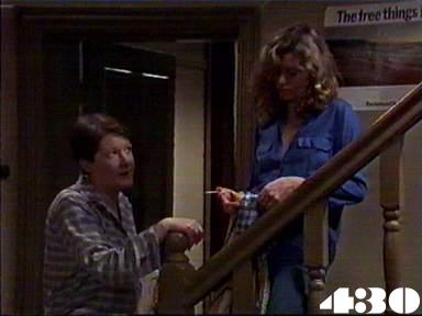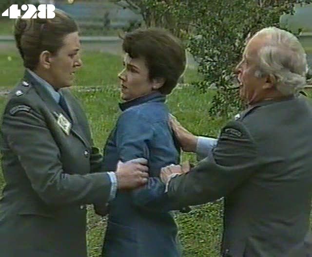 EPISODE 426Broadcast on Channel 5 Friday 18 December 1998 04:40 Pixie falls for an old flame, the women score a victory over Joan and the escape bid ends in tragedy.CREDITSMeg ~ Elspeth BallantyneJudy ~ Betty Bobbitt Erica ~ Patsy King Joan ~ Maggie Kirkpatrick Colleen ~ Judith McGrath Ann ~ Gerda Nicolson Wally ~ Alan Hopgood Pixie ~ Judy McBurney Sonia ~ Tina Bursill Cass ~ Babs McMillan Minnie ~ Wendy Playfair Bobbie ~ Maxine Klibingaitis Belinda ~ Jane Turner Helen ~ Caroline Gillmer Phyllis ~ Reylene Pearce Reb ~ Janet Andrewartha Rick ~ Andy Anderson Stanley ~ Brian James Hugh Bennett ~ Steve Cummins Major Ferguson ~ Carl Bleazby Gary Wilder ~ Nick Waters Kevin Stansfield ~ Tiriel Mora Det. Insp. Thorn ~ Peter Aanensen Det. Insp. Bowen ~ Vin Foster Ralph Cranton ~ Mark Morrisey Mr Schumann ~ Mark Zandle Off. Radcliffe ~ Marion Dimmick Detective ~ Bob Halsall Reception Nurse ~ Mary Rose Casey Plainclothes Policeman ~ Justin Rich Gate Guard Bob ~ David Bickerstaff Stunt Driver ~ Phil Brock UNCREDITEDCoral (receptionist) has her first (?) line | Judy makes it clear to Joan that the women know her father has been kidnapped. She demands that Joan phones the police and clears Colleen (but when she says she wants Colleen back as "Deputy" Governor, she surely means "Acting" Governor?) Gary tells Kevin he will kill Reb when she has led him to the money. Joan makes a statement to Inspector Thorne but finds out the other witness has already spoken to the police, so Colleen was already cleared. She announces Colleen's reinstatement and her own resignation to the women to make them give up Reb. The women don't believe it until Meg holds up the signed resignation. Erica tells Joan the kidnappers have extended the deadline by two hours. The Major sends Gary to phone Joan: Kevin is already in place at the hospital. Erica takes the call intended for Joan, and learns of the kidnap plot: she confronts Joan and tells her she should have reported it to the police to help them trace the kidnappers. Gary returns to find the Major on the phone to the police and knocks him out. The police take over and go ahead with the swap. Colleen returns and is told Joan has resigned. Kevin is suspicious of all the extra "doctors" at the hospital |