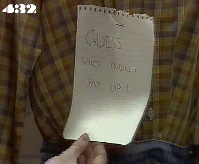 EPISODE 431Broadcast on Channel 5 Friday 25 December 1998 04:40 Mo becomes the victim of an unjust law. Bill goads Myra into violence.CREDITSMeg ~ Elspeth BallantyneJudy ~ Betty Bobbitt Colleen ~ Judith McGrath Ann ~ Gerda Nicolson Sonia ~ Tina Bursill Minnie ~ Wendy Playfair Cass ~ Babs McMillan Bobbie ~ Maxine Klibingaitis Helen ~ Caroline Gillmer Mo ~ Bronwyn Gibbs Reb ~ Janet Andrewartha Camilla ~ Annette Andre Phyllis ~ Reylene Pearce Stanley ~ Brian James Rick ~ Andy Anderson Eddie ~ Norman Yemm Myra Desmond ~ Anne Phelan Alan Desmond ~ Peter Craig Kay Desmond ~ Sally-Anne Bourne Bill Desmond ~ Vince D'Amico Gloria Payne ~ Totty Goldsmith VJ Humphreys ~ Lloyd Cunnington Inspector Maynard ~ Neil Thompson Off. Radcliffe ~ Marion Dimmick Off. Bailey ~ Maureen Edwards Charlie ~ John Adams Barman ~ James McRae Rob ~ Dominic Stringa | Sonia tells Reb she hopes she doesn't expect her to cover the bets she took on the snooker game: Judy teases Reb by suggesting it's not surprising she lost, as Cass's Uncle Eddie was Eddie Charlton. Rick comes round next morning still tied up in the back of a car in the junkyard. Myra feels guilty for hitting Kay (when did she do that?) Work starts at the junkyard and the car Rick was in goes into the crusher. Ann has a staff shortage: Joan has taken leave to visit her father and Rick hasn't turned in. Reb tries to back out of paying up on the bets on the grounds that Cass was coached by a professional, but Judy lets her know it was only a joke. Rick comes round again in a hotel room: Eddie has rescued him. Eddie tells Rick to forget what he saw. The VJ gives Reb an extra six months: Mo gets an extra month for slapping Joan and tells the women later that Joan didn't give evidence in person because she has taken time off work. Cass takes to heart Reb and Sonia's comments about her singing voice and decides to drop out of the glee club group. Alan goes to see Bill and gets a punch in the mouth for interfering. Myra explains to Judy that she can't take over Driscoll as her family problems take first place. Helen and the others take advantage of Joan's absence to taunt Sonia. The women find Cass in the rec room with ruined pianola rolls in her hands: she claims not to have done the damage. Stan walks in and is obviously shocked and hurt by the vandalism. Kay overhears Myra's casual threat to kill Bill. Rick goes looking for Eddie: he is told to keep his nose out. Minnie finds that the piano part of the piano still works so the Glee Club can continue their rehearsals. Mo hears that Susan Jordan has been caught for the cat burglaries: Judy is worried that she will not be released even so. Camilla offers Mo a job looking after her flat. Meg speculates that since Pixie hasn't been traced, something might have happened to her: given Pixie's trusting nature, she may even have been abducted. Mo is told she has to serve two weeks of the extra month, so Camilla phones up her own radio program to tell Mo's story on air. Meg hears the radio and stops the call. Ann is told that Camilla, not Mo, is to be released as a result. Myra comes home to find Bill and Gloria in the lounge: Bill tells her he's moving back into the family home and is bringing Gloria with him. Rick reports to Inspector Maynard that he's seen Eddie in suspicious negotiations with associates of Fellowes, but is told no action will be taken. After Rick leaves, we see that Eddie has been listening in the next room, and comments that Rick's novelty is a dangerous quality. During an argument, Myra is horrified |
