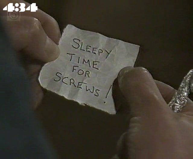 EPISODE 433Broadcast on Channel 5 Sunday 27 December 1998 04:40 Two women become the victims of a poisonous snake at Wentworth. Colleen's family are at the mercy of Rick's enemies.CREDITSMeg ~ Elspeth BallantyneJudy ~ Betty Bobbitt Colleen ~ Judith McGrath Ann ~ Gerda Nicolson Sonia ~ Tina Bursill Minnie ~ Wendy Playfair Cass ~ Babs McMillan Bobbie ~ Maxine Klibingaitis Helen ~ Caroline Gillmer Reb ~ Janet Andrewartha Phyllis ~ Reylene Pearce Myra ~ Anne Phelan Rick ~ Andy Anderson Stanley ~ Brian James Alan Desmond ~ Peter Craig Kay Desmond ~ Sally-Anne Bourne Dr Toohey ~ Tom Travers Kevin Stansfield ~ Tiriel Mora Sarah Webster ~ Fiona Paul Henchman ~ Marcus Eyre Jennifer Powell ~ Sarah Machin Robert Powell ~ Robert Palmer Patrick (Double) ~ John Devlin | Next morning Sonia asks Rick to check her cell, claiming to have heard something moving in the night and accuses the women of putting something in her cell. Kay refuses to believe Alan when he tries to tell her what her father was really like and refuses to change her statement to the police. Reb won't help Sonia by trying to find out who is tormenting her. Meanwhile, the snake moves on down the corridor from Sonia's cell |