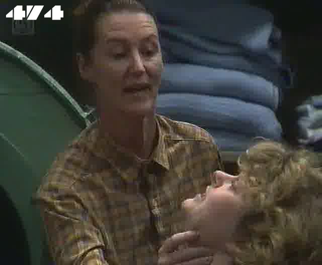 EPISODE 474Broadcast on Channel 5 Tuesday 23 February 1999 04:40 Bev continues to look for thrills inside Wentworth by frightening her fellow prisoners. Meanwhile, Joan's dismissal has far-reaching implications.CREDITSMeg ~ Elspeth BallantyneJudy ~ Betty Bobbitt Joan ~ Maggie Kirkpatrick Ann ~ Gerda Nicholson Myra ~ Anne Phelan Reb ~ Janet Andrewartha Dennis ~ Nigel Bradshaw Bev ~ Maggie Dence Bobbie ~ Maxine Klibingaitis Marlene ~ Genevieve Lemon Dot ~ Alethea McGrath Heather ~ Victoria Nicolls Joyce ~ Joy Westmore Shane Munroe ~ Robert Summers Nicky (Dog) ~ Himself Ray ~ Alex Menglet Diedre Kean ~ Anne Charleston Mr Warren ~ John Proper Mrs Warren ~ Eve Godley Det. Kendall ~ Greg Smith Alice ~ Lois Collinder Frances ~ Wanda Davidson Off. Slattery ~ Dorothy Cutts Off. Radcliffe ~ Marion Dimmick Geoffrey Johnson ~ John Murphy Dr John Bishop ~ Rod Densley Sister Hall ~ Gael Andrews Gate Guard ~ Bryan Dolan Scab ~ Rick Ireland Spider ~ Shaunagh-Lyn Weaver Policeman 1 ~ Paul Dawber Policeman 2 ~ Bill Fozz Officer ~ Jacqui Jackson Joyce mentions that a new area is to be converted as a visiting suite. | Bobbie knocks out a guard (with one kick of her plimsolls) and her absence is confirmed by a head count. Heather takes Dennis out for a meal in a Chinese restaurant and teaches him how to use chopsticks. Judy dismisses Dot's chest pains as malingering, even though Dot wants to know what from her what a heart attack feels like. Bobbie looks up her friends in her old haunts, but no-one is able or willing to help her. Bev seems intrigued by the idea of being top dog as a "new experience" she hasn't had and tells Myra she's going to take over - while idly playing with a pillow, which she holds as if preparing to smother her. Dennis sees Bobbie after leaving the restaurant with Heather, gives chase and catches her |