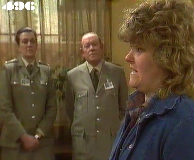 EPISODE 498Broadcast on Channel 5 Sunday 28 March 1999 04:40. Ann and Meg are taken to a deserted building by Brian Lowe, who intends to kill them as soon as he receives the ransom money. Len and Joan are furious when Joyce is appointed Acting Governor.![]() Meg ~ Elspeth Ballantyne Judy ~ Betty Bobbitt Joan ~ Maggie Kirkpatrick Ann ~ Gerda Nicholson Myra ~ Anne Phelan Reb ~ Janet Andrewartha Len ~ Maurie Fields Pixie ~ Judy McBurney Bobbie ~ Maxine Klibingaitis Marlene ~ Genevieve Lemon Joyce ~ Joy Westmore Sam ~ Robyn Gibbes Phillip ~ Steve Kuhn Chris ~ Gregory Ross Sarah ~ Nell Johnson Off. Bailey ~ Maureen Edwards Det. Insp Rouse ~ Paul Karo William Coleby ~ Hu Pryce Brian ~ Mathew King Mrs Lowe ~ Patsy Martin Mrs Cleary ~ Babs Wheelton Plain Clothes Cop Reg ~ Bill Fozz Plain Clothes Cop 1 ~ Helmut Jensen Media Man No. 1 ~ Peter Elliot Media Man No. 2 ~ Graeme Bowman Media Man No. 3 ~ Peter Tandy Pre-Teen Boy No. 1 ~ Tibor Kaman Pre-Teen Boy No. 2 ~ Tamlyn Lord "Phillips" again - still, too late to correct it now (snigger). There are allusions to Helen Smart and Erica in connection with the prisoners in isolation. | Lowe forces Meg at gunpoint to drive them all to a hiding place |