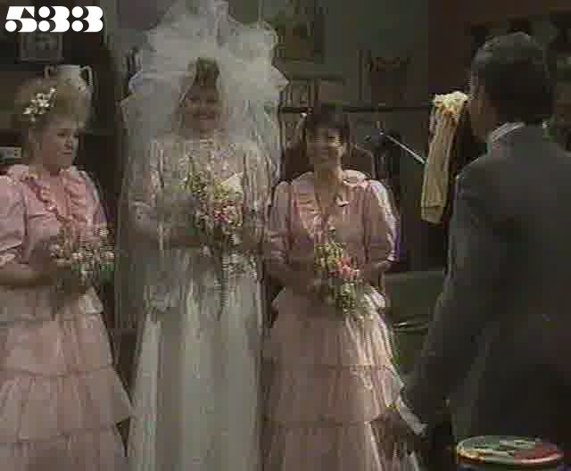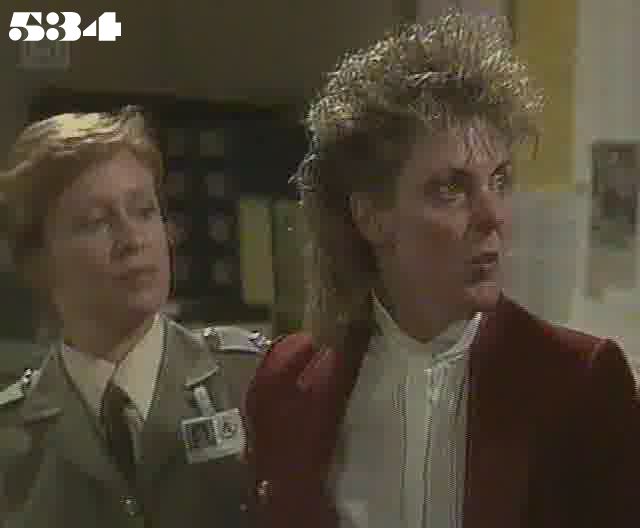 EPISODE 533Broadcast on Meridian Tuesday 10 February 1998 23:40; Channel 5 Sunday 01 August 1999 04:40. Geoff and Myra overpower Frank and Lou. The wedding is on rocky ground already, thanks to Matt's transfer.CREDITSMeg ~ Elspeth BallantyneJudy ~ Betty Bobbitt Joan ~ Maggie Kirkpatrick Ann ~ Gerda Nicolson Myra ~ Anne Phelan Dennis ~ Nigel Bradshaw Marlene ~ Genevieve Lemon Lexie ~ Pepe Trevor Joyce ~ Joy Westmore Anita ~ Diane Craig Bobbie ~ Maxine Klibingaitis Lou ~ Louise Siversen Matt ~ Peter Bensley Geoff ~ Les Dayman Frank ~ Trevor Kent Andrew Fry ~ Howard Bell Mrs Warren ~ Eve Godley Mr Warren ~ John Proper Mrs Delany ~ Judith Roberts Mr Delany ~ Colwyn Roberts Adam Delany ~ Shane Lee Julian Cream ~ Don Gray Sister Hall ~ Gael Andrews Pat Slattery ~ Dorothy Cutts Officer Green ~ John Allen Policeman 1 ~ Bill Binks Policeman 2 ~ Ian Sprake Celebrant ~ Leonie Collins Organist ~ Freddie Gulliford Photographer ~ David Blackman Matt's parents are credited as "Mrs Delaney" and "Mrs Delany" - the latter is his father! | ...but Myra and Geoff turn the tables on them. Lou manages to escape from the library but Frank doesn't and ends up with another retaliatory kick in the crutch (with a few extra names added to the list of the women it is "for"). When Lexie questions Catholic doctrine on contraception, Anita shrugs and agrees with her, suggesting that she must be a liberation theologist on the quiet. Anita patches Lou up when she returns to her cell after the fight. Judy and Myra help Frank to get medical assistance. Lou rejects Anita's help, saying she doesn't need anyone, though her tearfulness tells another story. Ann gets no sense out of Frank or Geoff about the fight when she interviews them in the infirmary, but Myra lags on Frank to save Geoff's parole, despite Geoff's cries from the other room to try to prevent her. Myra has to admit to Lexie later that she lagged on Frank, but no-one can find it in their hearts to condemn her, although Anita lets Myra know she doesn't approve of violence. Marlene is given her mother's own dress from her wedding in 1960 which turns out to be a perfect fit, and after a honey blond rinse (which apparently has the power of industrial bleach) her hair has returned to its usual colour. Frank is sent to solitary after being restrained by Officer Green and Dennis and sedated by Sister Hall. Bobbie returns - wearing an engagement ring herself. The officers discuss Lou Kelly's bruised face as she is taken through reception to go to court. Joan overhears and assumes they are hinting she is responsible. Andrew Fry from the Deaprtment throws a spanner in the works by visiting to deliver the order that Matt and Frank are to be transferred to a prison farm at Gonella immediately after the wedding. Geoff will stay at Wentworth until his parole hearing is over. Ann lets Mr Fry know how disgusted she is with the Department's ruling. Marlene is upset that she she won't have a first night together with Matt but then decides to put a brave face on it. Following Ann's hints, Pat Slattery "loses" the paperwork to let the wedding go ahead and suggests she might be able to find it again around three in the afternoon. Matt's and Marlene's parents meet for the first time in the grounds. Matt's father gives 200 acres of land as a wedding present. Judy gives Marlene Pixie's lucky cardboard horseshoe (as it obviously worked so well for her). The transfer van arrives but the police officers have to wait. Matt and Marlene are married in the grounds, and read the embarassing vows they have written themselves to each other. After an hour and a half, Pat finds the papers, but when she explains the reason for the deception, the police officers agree to let the newlywed couple have another half an hour together. Joyce is shocked to discover Geoff and Myra snogging behind the marquee. Frank and Matt are transferred, but before he leaves Frank threatens to get even with Dennis some day. Myra catches the bride's bouquet as Judy nudges Lexie and Bobbie out of the way. Marlene decides not to watch the transfer van leaving.