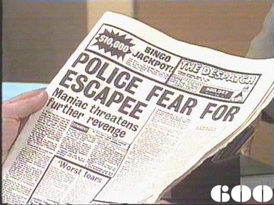 EPISODE 599Broadcast on Channel 5 Sunday 19 March 2000 04:45 Lexie spots the headlines "Madman murders prison escapee", and the phantom lagger strikes again.![]() Joan ~ Maggie Kirkpatrick Ann ~ Gerda Nicolson Joyce ~ Joy Westmore Eve ~ Lynda Stoner Jessie ~ Pat Evison Nancy ~ Julia Blake Rita ~ Glenda Linscott Julie ~ Jackie Woodburne Lou ~ Louise Siversen Lexie ~ Pepe Trevor Bob ~ Peter Adams Ettie ~ Lois Ramsay Alice ~ Lois Collinder Mervin ~ Bruce Crowl Steve ~ Peter Hayes Dan ~ Sean Scully Fay Donnelly ~ Maud Clark Janet Williams ~ Christine Earle Pat Slattery ~ Dorothy Cutts Policeman ~ Geoff Staples UNCREDITEDMabel Morgan ~ Val Jellay | Lexie wakes up after a night sleeping rough in a wood to find her new canine friend is still by her side. She decides to call "him" (though observant Digest contributors spotted that the dog is female...) by the name "Pocco" after a pet rabbit she once had. Bob catches Rita in the laundry still sitting astride the dryer and is sympathetic about her loss but firmly tells her to get down and go back to her cell. Rita is disgusted that he still wants her to be searched before she leaves the laundry, and asks what she could possibly have stolen. Alice shows the photo of Steve around. Most of the women are too busy speculating on what Steve's strategically placed knee really conceals, but the eagle eyed Eve notes that he is described as a medical student and wonders what he is doing working as a handyman. Rita rejects Nancy's attempt to mother her and get her to talk about Slasher's death. Alice sees Steve doing a bit of DIY in the shower block and stages a faint in front of him. He dashes away hastily, claiming he can't respond to Alice's overtures because he wants to keep hold of his job (and his dinner, I guess). Lexie finds out about Nora from a newsstand ("MANIAC MURDERS ESCAPEE - FURTHER THREATS"