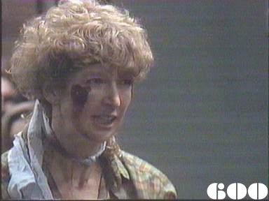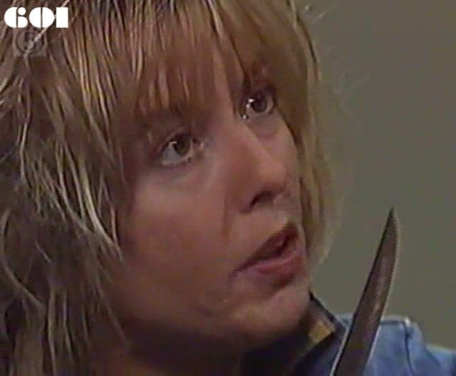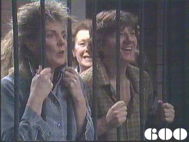 EPISODE 600Broadcast on Channel 5 Saturday 25 March 2000 04:40. Julie is badly beaten in the kitchen and Eve's murder is to be made to look like suicide.![]() Joan ~ Maggie Kirkpatrick Ann ~ Gerda Nicolson Joyce ~ Joy Westmore Eve ~ Lynda Stoner Jessie ~ Pat Evison Nancy ~ Julia Blake Rita ~ Glenda Linscott Julie ~ Jackie Woodburne Lou ~ Louise Siversen Lexie ~ Pepe Trevor Barbie ~ Jayne Healey Bob ~ Peter Adams Ettie ~ Lois Ramsay Mervin ~ Ernie Bourne Alice ~ Lois Collinder Steve ~ Peter Hayes Wendy Stone ~ Vivean Davies Fay Donnelly ~ Maud Clark Mabel ~ Val Jellay Delores ~ Samantha Bews Mitzy ~ Jane Menz Off. Radcliffe ~ Marion Dimmick Driver No 1 ~ Charles McCracken Driver No 2 ~ Steve Gunn Gate Guard Bob ~ David Bickerstaff The scene of Eve's hanging was cut on its first showing in some ITV regions. Channel 5 showed a longer version of this crucial scene. | After Alice passes on the information to her about the true identity of the Phantom Lagger, Lou checks the details of Lexie's escape with Julie then decides to punish Eve and those breaking the hunger strike. Meg phones in sick and Bob tells her not to come in for the evening shift. Joyce shows Bob the newspaper headline about Lexie's escape |