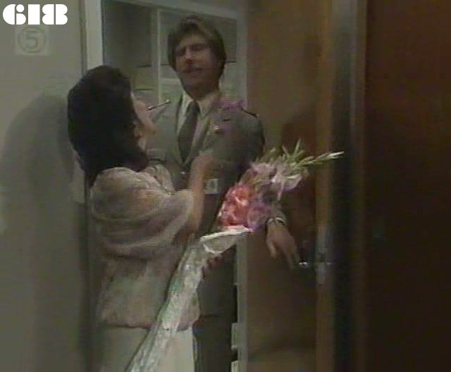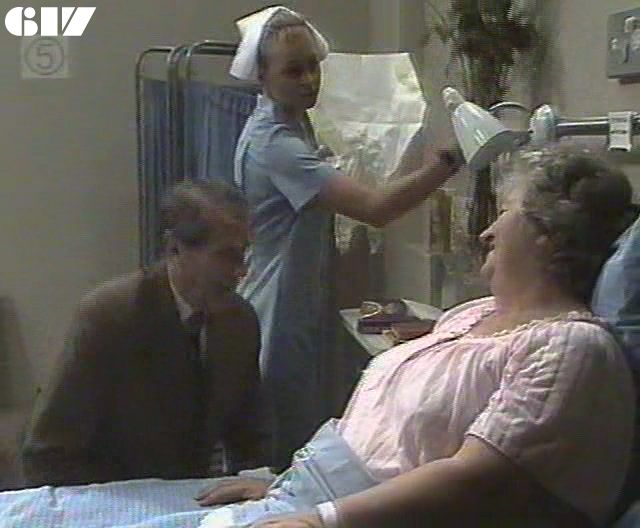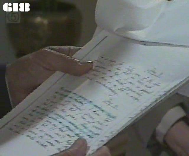 EPISODE 618Broadcast on Channel 5 Saturday 27 May 2000 04:40. Nancy naively starts to keep a diary recording everything that goes on in prison. Steve has big plans for Julie.![]() Meg ~ Elspeth Ballantyne Joan ~ Maggie Kirkpatrick Ann ~ Gerda Nicolson Joyce ~ Joy Westmore Nancy ~ Julia Blake Rita ~ Glenda Linscott Julie ~ Jackie Woodburne Lexie ~ Pepe Trevor Alice ~ Lois Collinder Jessie ~ Pat Evison Kath Maxwell ~ Kate Hood Janet ~ Christine Earle Bob ~ Peter Adams Dan ~ Sean Scully Mervin ~ Ernie Bourne Steve ~ Peter Hayes Taps ~ Valma Pratt Uncle Perc ~ Vic Gordon Sister Hall ~ Gael Andrews James Dwyer ~ James Condon Tom Harley ~ Vince Gill Nurse ~ Nicki Woolmington Jim Barry ~ Iain Murton Mitch ~ David Le Page Male Prison Officer ~ Bill Tisdall Secretary ~ Jenny Ryan Ambulance Man ~ Ray Hutchinson Ambulance Driver ~ Campbell Higgins Fight Co-Ordinator ~ Glenn Ruehland Gerda Nicolson still has a cold, particularly noticeable in the scene near the end with Rita. Jessie says she hopes Ann "POQs": Pisses Off Quick? Lexie's remark "Just like that other Weasel" is picked up by other writers as a nickname for Janet Williams. The first rec room scene is supposed to be at night, but it looks like it has been lit by Uncle Perc, with a very strong side light apparently coming from the direction of the rec room cupboard. The actor who plays the "Male Prison Officer" in fact appears to be John Allen (Officer Green) | Dan is taken to hospital after croaking in Ann's ear that she should go easy on Rita, as the escape was not her idea. Ann tells Bob to call in some officers from leave (including Joan) to cover for her absence. The wedding reception continues, videoed by Uncle Perc - with an old style video camera that requires there to be extra lighting in the shape of a studio spotlight. He may well have shot the wedding video too, as he actually asks (without any detectable trace of sarcasm) for some Vaseline to smear on the camera lens. Steve tells Meg he intends to propose to Julie before her parole hearing to give her something to look forward to. Lexie gets Alice to threaten Janet when delivering her tray to solitary: as a way of getting her own back, Janet lets Joan know about Bob and Kath's relationship. Although Joan already knows or suspects as much, it is obviously a surprise to Alice. At the hospital, Ann is told that Dan has suffered two broken legs and a spinal injury and needs to be put in traction. Alice tells the women about Kath, and a deputation is sent to ask Kath some "polite questions". Joan confronts Bob with Janet's allegation, but he tells her that Ann already knows about his friendship with Kath. However, Bob realises that if their secret has become public knowledge, then Kath is in danger. Rita, Alice and Lexie find Kath in the gym (where she has conveniently wandered, apparently to conduct an inspection of the equipment) and threaten her. Kath grabs a barbell to defend herself |