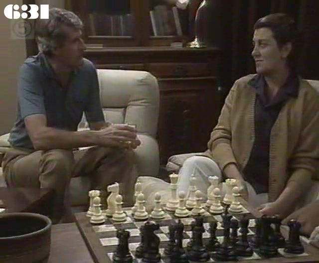EPISODE 631Broadcast on Channel 5 Saturday 15 July 2000 04:40.![]() Ann ~ Gerda Nicolson Joan ~ Maggie Kirkpatrick Meg ~ Elspeth Ballantyne Rita ~ Glenda Linscott Lexie ~ Pepe Trevor Alice ~ Lois Collinder Nancy ~ Julia Blake Kath ~ Kate Hood Lorelei ~ Paula Duncan Janet ~ Christine Earle Roach Waters ~ Linda Hartley Marty Jackson ~ Michael Winchester Merle ~ Rosanne Hull-Brown Andrew Hinton ~ Fredric Abbott Delia Stout ~ Desiree Smith Rodney Adams ~ Philip Hyde Harry Parker ~ Howard Priddle Margie Fleming ~ Helen Milte Pat Slattery ~ Dorothy Cutts Chikka ~ Ingle Knight Morgan McDermott ~ Maurice Marion | Joan tells Andrew she's not right for him, but does not correct his assumption that Terri was a man (perhaps because of the powerful visual metaphor that their relationship is a game of chess |