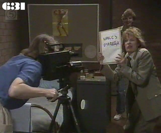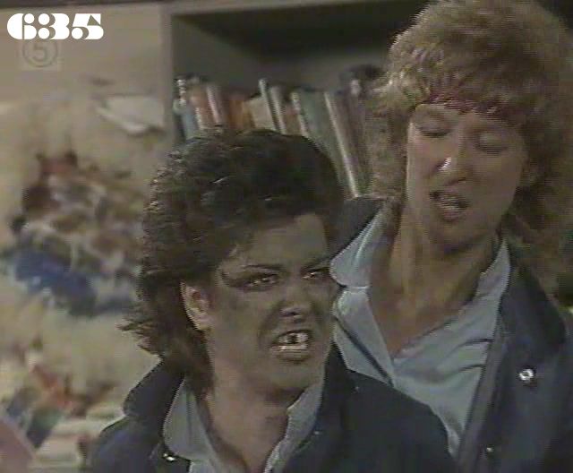EPISODE 632Broadcast on Channel 5 Sunday 16 July 2000 04:40. Andrew tells Joan that they cannot continue their relationship but he wants to remain friends. Janet swaps videotapes, an action that could incriminate them all.![]() Joan ~ Maggie Kirkpatrick Meg ~ Elspeth Ballantyne Ann ~ Gerda Nicolson Rita ~ Glenda Linscott Lexie ~ Pepe Trevor Alice ~ Lois Collinder Nancy ~ Julia Blake Kath ~ Kate Hood Lorelei ~ Paula Duncan Janet ~ Christine Earle Roach Waters ~ Linda Hartley Merle ~ Rosanne Hull Brown Marty ~ Michael Winchester Rodney ~ Philip Hyde Delia ~ Desiree Smith Pat Slattery ~ Dorothy Cutts Andrew Hinton ~ Fredric Abbott Vicki ~ Rebecca Dines Barman ~ Bill Manderson Ida ~ Paddy Burnet Thanks to Nico for sending the credits from the TV4 broadcast. | Ann gives Rodney and Marty a warning not to pursue personal disagreements at work and brushes aside Rodney's implication that it was Marty's fault for taking too seriously what was only meant to be a joke. Ann keeps Rodney back to question him about the incident with Merle: he flatly denies that Merle attacked him. Delia defends Marty when Rodney starts to criticise him in his absence: he gets back at her by accusing her of having a crush on him and cruelly pointing out she hasn't much hope of anything developing. Lexie devises a plan to embarrass Rodney and stop Joan's drug dealing in one go. Alice is cautious about letting Roach know about the threat to Bongo in case she tells Kath. Lexie chums up to Rodney and lets him borrow her cassette player for the aerobics class. After a crafty sniff of coke, Kath has her "evil" head firmly on and she starts to psych Merle up to attack Rita. Janet warns Kath that Rita and her gang are plotting against her. Ann sees Rodney in his shorts ready for the aerobics session and tells him to change as they are too tight and risk inflaming the women's lusts (not that you can see anything, nor does there appear to be much there to see). Outside during the exercise period, Roach accuses Rita of putting revenge against Joan before Bongo's safety. Rodney borrows Mervin's shorts to avoid exposing himself to comment. Kath and Janet dress Merle up in ridiculous clothes and send her out to be mocked by Rita. Meg calls a halt to the aerobics class when the women start to make fun of Rodney. The two groups meet in the corridor and Merle lays Rita out with one punch. Joan makes a point of brusquely demanding Merle's transfer to an asylum, safe in the knowledge that this will make Ann even more certain to do the opposite. Merle is sedated and sent to solitary. Rita is devastated that she had been so easily beaten, and Nancy's suggestion that it was a lucky punch doesn't do much to help. After Ann has talked to Merle and is satisfied that she has calmed down, she is allowed to go back with the women. Kath is now feeling guilty about using Merle (perhaps the cocaine has worn off). Janet suggests voting for another top dog. Nancy prepares to show the video in the rec room: Janet goes to fetch Joan, but Meg tells her that Joan is off duty until the following day. Suspicious about Janet's request, Meg reports to Ann that she suspects Janet is Joan's new informant. Kath sniffs coke and exercises vigourously in the gym with manic intensity, sending Janet away when she comes to find her with a new plan. Meg walks into the rec room during a showing of the video