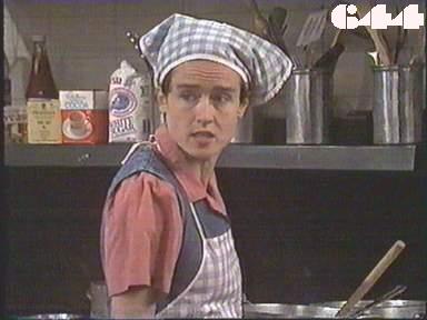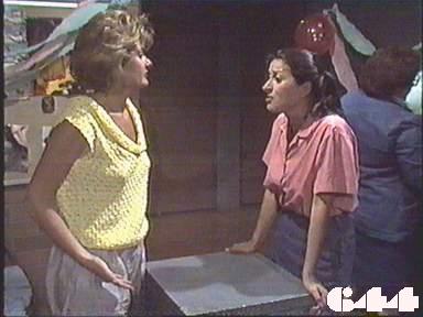 EPISODE 644Broadcast on Channel 5 Sunday 27 August 2000 04:40. Joan is still missing, Rita ends up in solitary and Kath takes advantage of the situation.![]() Ann ~ Gerda Nicolson Meg ~ Elspeth Ballantyne Mervin ~ Ernie Bourne Marty ~ Michael Winchester Delia ~ Desiree Smith Rodney ~ Philip Hyde Kath ~ Kate Hood Merle ~ Rosanne Hull-Brown Lexie ~ Pepe Trevor Lorelei ~ Paula Duncan Vicki ~ Rebecca Dines Nancy ~ Julia Blake Rita ~ Glenda Linscott Alice ~ Lois Collinder Peter McCormack ~ Steve Bastoni Dani McCormack ~ Sarah Machin Tanya Fellows ~ Elizabeth Rogers Ronnie Kennedy ~ Lyn Ford Angela Hopkins ~ Rosie Lalevich Gate Guard Roger ~ Bryon Dolan Mr Watkins ~ Bruce Crowl UNCREDITEDJoan ~ Maggie Kirkpatrick (possibly because she only appears at the end?)"Mr Watkins" is credited in error - he doesn't appear until (646). There is no gate guard in this episode. | Rodney overhears the women's conversation in solitary, but Nancy hears his keys clinking and warns the others to be quiet. Kath collects protection money from a reluctant Ronnie. Lorelei pays up too, and Lexie finds she has to pay "for two". Delia tries to find out from Mervin if he's heard anything from Joyce about the trainees' permanent placements. Kath asks Rodney to put a note in Rita's food in return for information about what happened on the boat trip. Ann points out to Meg that Joan's disappearance won't look good on Delia and Marty's records. Lorelei sets up a swap shop: junk in return for cigarettes and of course everyone wants to join in, even though it puts Kath's nose out of joint. Kath tells Merle to put furniture polish in all three meals for solitary. Rodney baits Marty and Delia about what they will put in their reports on the work experience. Mervin sends the doctored meals to isolation instead of solitary. Merle follows and bumps into Tanya, knocking her flying and sending the meals onto the floor. Marty asks Rita what happened to Joan: she says she left Joan alive and hopes she comes back. Kath assures Merle she did the right thing by stopping the meals getting to isolation. Delia brings some tarts Mervin has made for a surprise party for Mervin, and Lexie has drawn a special card for her, depicting "Captain Merle-velous" |