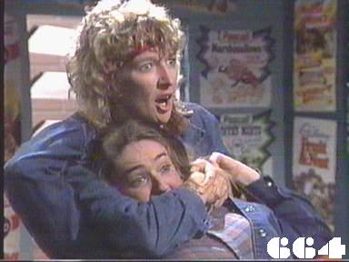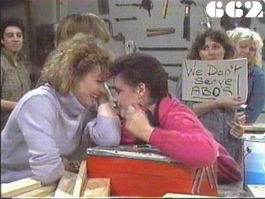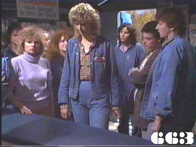 EPISODE 662Broadcast on Channel 5 Saturday 04 November 2000 04:40. Joan catches Rodney in the process of bashing a prisoner. Lester's belongings are delivered to Lisa in jail.![]() Joan ~ Maggie Kirkpatrick Ann ~ Gerda Nicolson Joyce ~ Joy Westmore Rita ~ Glenda Linscott Alice ~ Lois Collinder Kath ~ Kate Hood Lorelei ~ Paula Duncan Merle ~ Rosanne Hull-Brown Rodney ~ Philip Hyde Delia ~ Desiree Smith Mervin ~ Ernie Bourne Vicki ~ Rebecca Dines Spider ~ Taya Stratton Sarah ~ Kylie Belling Pamela ~ Justine Saunders Marty ~ Michael Winchester Lisa ~ Terrie Waddell Bruce West ~ Peter Drake Joanne West ~ Vicki Mitchell Adrian Harrow ~ John Mortimore Rodney tells Ann "I'm not an officer any more, Mrs Reynolds: I know my job backwards". Presumably this is a line fluff and he should have said that he's not a trainee officer any more. Spider claims to have been watching Joan for "four bloody years" but Joan at least has been there to observe for longer than that. | Joan stops the beating, sends Rodney out of the cell and takes Spider to sick-bay, despite her initial insistence that she won't be cleaned up until the Governor sees her. Spider accuses Rodney and Joan to Joyce when she arrives on the scene, but Joan pours scorn on the allegation. Joan is angry with Rodney for "going too far" and tells him she will insist on an immediate Departmental investigation, but she will fix it so it appears that Spider is trying to frame her and Rodney. Rodney is interviewed by Mr Harrow from Internal Affairs but his denials that he even touched Spider fails to convince him even though Rodney's hands are unbruised when he is asked to show them. Spider is put back in her cell as the other women shout to her to try to find out: Spider shouts back that she is sure Rodney and Joan will be out of a job and they have her to thank for it. Joan backs up Rodney by claiming Spider must have got someone to bash her before lockup. Mr Harrow tells Ann that he has no evidence and rules that charges against Joan and Rodney are to be dropped. The women are outraged when Ann announces the decision in the dining room. Alice warns Spider she should not to take action on her own or they will lose the shop. Ann warns Rodney to watch his step and if she ever finds any evidence that he bashed Spider, he could still be prosecuted. Marty has to prevent Sarah going for Spider when they trade insults walking along the corridor after muster. Lisa is shown Lester's pitifully few possessions in a cardboard box and a note from Wendy, which she tears up, but it turns out she cannot keep any of the things. Rita tries to explain to Sarah why they have to back Spider against the officers. Rodney tries to suck up to Joan, but she freezes him out. Lorelei and Lisa comfort each other. Marty sends Merle and Sarah to get paint for the shed, but Sarah scares Merle away by pretending she's about to put a curse on her. Spider takes the opportunity to drive a tractor at Sarah, but Merle pushes her out of the way |