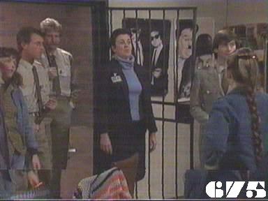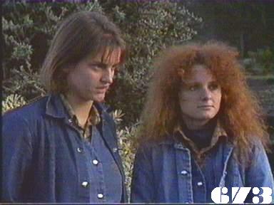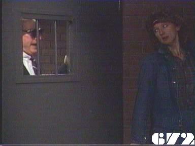 EPISODE 672Broadcast on Westcountry Monday 18th August 1997 23:45 p.m; Channel 5 Saturday 09 December 2000 04:40. Craven continues his reign of terror. Merle turns a game she is playing with Tommy into a police siege.![]() Meg ~ Elspeth Ballantyne Joan ~ Maggie Kirkpatrick Ann ~ Gerda Nicolson Joyce ~ Joy Westmore Rita ~ Glenda Linscott Alice ~ Lois Collinder Kath ~ Kate Hood Lorelei ~ Paula Duncan Merle ~ Rosanne Hull-Brown Marty ~ Michael Winchester Delia ~ Desiree Smith Spider ~ Taya Stratton Lisa ~ Terrie Waddell Spike ~ Victoria Rowland Brumby ~ Sheryl Munks Ernest Craven ~ Ray Meagher Tommy Kipman ~ Bradley Kilpatrick Kate Carter ~ Adair Stagg Policeman Hogan ~ Peter Stewart Uniformed Policeman ~ Adrian Jenkins Policeman Briggs ~ Justin Gaffney Newsreader ~ Jennifer Hansen Harold Carter ~ Robert Kemp Sharpshooter ~ Ed Ryan I can't be sure about the identification of the police officers credited in this episode. Presumably the two named ones are these two | Spike tells Rita of her plan to rig up an alarm in her cell so she can attract attention if anyone tries to harm her. Tommy takes Merle some food and hears about her on the radio. Lorelei has a quick word with Rita and apologises for messing up her attempt to get Craven. Tommy plays truant from school to spend the day with Merle. Spider fails to persuade Kath to sell booze and drugs and tells her if she won't agree she'll do it on her own. Alice asks Spider to try out the press, but it has been fixed and she can't get the lid up again. Spike fixes the alarm so that Rita can set it off from her cell. Craven produces a crossbow confiscated at Blackmoor: Joan lets him know she is unhappy with his plan to kill Rita with it even when he says he intends to frame someone (anyone) else for it. Marty catches Spike in the boiler room, so she has to explain the purpose of the alarm. Alice tells Rita she can set the alarm by putting something metallic across the taps in her cell. Meg disturbs Craven outside Rita's cell as he is about to use the crossbow. Joan questions Kath about the sabotage campaign and won't settle for her insistence that it is nothing to do with her. Lorelei is ordered by Craven to find out who's behind the sabotage, and Alice tells her about the alarm and other sabotage plans. When forced by Craven she tells him about the stink bombs planned for the workshop but keeps the information about the alarm to herself. Spider brags to Kath that she's getting some booze and pills in through the delivery truck. Tommy brings Merle into the house while his parents are away at work. Craven tells Joan she has decided to use the stink bombs as cover for his attack on Rita. Spike tells Marty her story: she was framed for the murder of her partner in manufacturing amphetamines. The neighbours |
