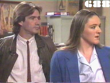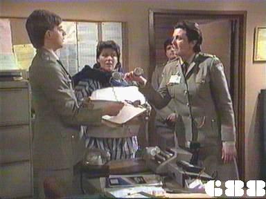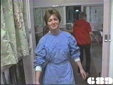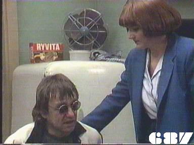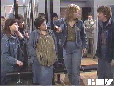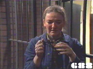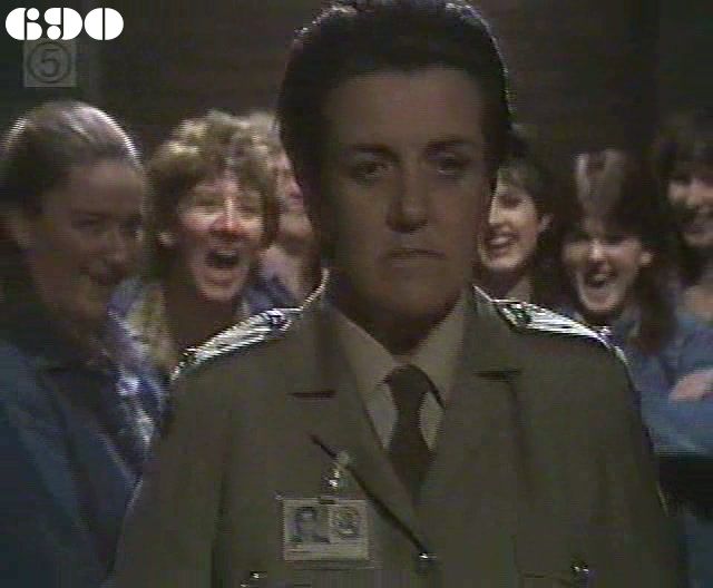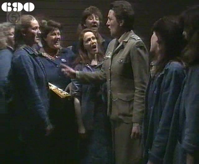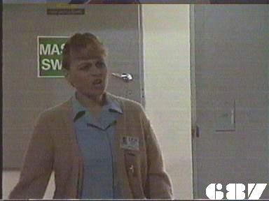 EPISODE 687Broadcast on Westcountry Monday 13th October 1997 23:45; Channel 5 Sunday 28 January 2001 04:40. Kath escapes from her minders. Rita receives some shattering news.![]() Meg ~ Elspeth Ballantyne Joan ~ Maggie Kirkpatrick Ann ~ Gerda Nicolson Rita ~ Glenda Linscott Alice ~ Lois Collinder Kath ~ Kate Hood Merle ~ Rosanne Hull-Brown Rodney ~ Philip Hyde Marty ~ Michael Winchester Lisa ~ Terrie Waddell Spike ~ Victoria Rowland Brumby ~ Sheryl Munks Vicki ~ Rebecca Dines Off. Slattery ~ Dorothy Cutts Tom Lucas ~ John McTernan Terry Denson ~ Robert Ratti Matt Denson ~ Ross Thompson Doctor Lunn ~ Denzil Howson Policewoman ~ Patricia Anthony Orderly ~ Peter Boland UNCREDITEDIngleside Gate GuardThe attempts to disguise Terrie Waddell's pregnancy | Meg warns Ann that Joan may try to goad her into hitting her in front of witnesses. Ann tells Meg the next two for the reward flat are Brumby and Vicki: she explains it would be a good opportunity for them to make up now that Spider has left. Ann orders Rodney to publicly hand over the new tape recorder to Brumby, but Ann makes sure the women accept that he is being generous. Rodney finds out too late that it was the Department who were reponsible for paying for a replacement tape recorder. Kath tries to sneak out while Matt is on the phone to Terry, and makes a run for it after she is shot in the arm (or pretends to be). Ann announces she will be making tours of the work areas unescorted. Terry goes after Kath with a gun, and he manages to spot her running through the trees. Marty visits Merle in Ingleside, and finds her heavily sedated. Through her rambling, he manges to work out that Kath drugged Spike with a chocolate. Kath is cornered and held at gunpoint: she tells Terry that Merle knows everything and will reveal it if anything happens to her. Marty has brought Merle a comic, which seems to pacify a little. Matt and Terry confer about the threat represented by Merle and decide ring Mr Willis for advice. Despite both doing lots of kitchen duty, Vicki and Brumby are unable to work out what to cook for themselves. Lisa is returned to Wentworth on assault and theft charges: Joan lets Rodney do the induction. Tom Lucas arrives a new teacher for the women: his informal attitudes alarm even Ann and of course Joan takes an instant dislike to him. Lisa tells Ann that she was framed by Rodney, but her charges are unsupported so Ann cannot follow it up. Mr Willis phones back to tell Matt that Merle is certainly no threat to them. Realising she is in danger, Kath turns Matt's gun on Terry and shoots him in panic, then makes Matt hand over her getaway disguise. Tom is introduced to the women and immediately challenges Rita to a bench press contest. Joan calls in her favour with Rodney and demands his help to fix the women who stopped her getting a job. As Alice feared, Rita is too weak to continue with the bench presses. Spike apologises to Lisa for getting her into trouble, though Lisa doesn't bear her any grudges. Kath poses as Meg (not in that wig |